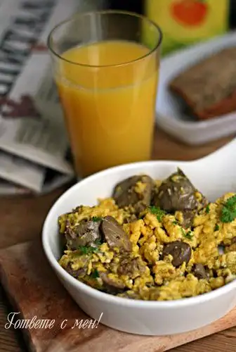 • Бърканите яйца с пилешки дробчета се сервират веднага.