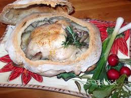 Замесва се тесто от предвидените продукти и се разточва на кора, по-голяма от съда, в който ще се пече пилето. Кората се слага в съда, намазан с мазнина и се поръсва с мазнина.