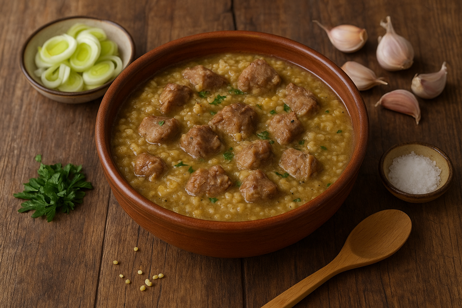 Добавяне на зърното: Просото се измива и се добавя в яхнията, варете още 20–30 минути, докато се разпадне и сгъсти бульонът.