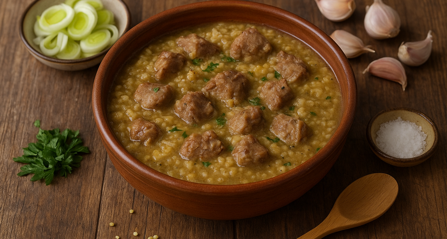 Добавяне на зърното: Просото се измива и се добавя в яхнията, варете още 20–30 минути, докато се разпадне и сгъсти бульонът.