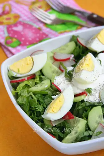 • Всяко яйце се нарязва на 6 части и се поставя в кръг около салата.