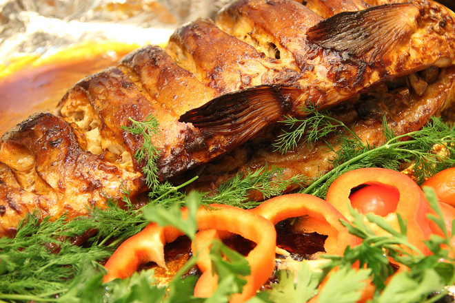 Съвет: Ако остане от плънката, може да я сложим около тавата с шарана.